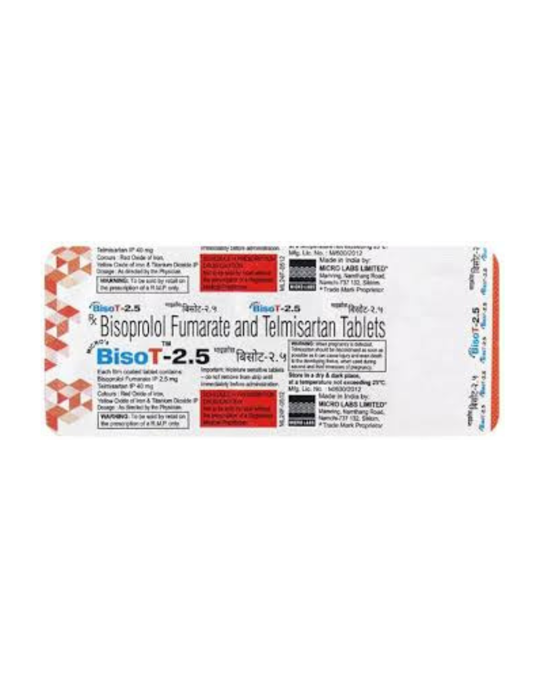 BISOT 2.5mg Tablet is a prescription medication combining Bisoprolol (2.5 mg), a beta-blocker, and Telmisartan (40 mg), an angiotensin II receptor blocker (ARB). This combination is primarily used to manage hypertension (high blood pressure) by reducing heart rate and relaxing blood vessels, thereby lowering blood pressure and decreasing the risk of cardiovascular events.